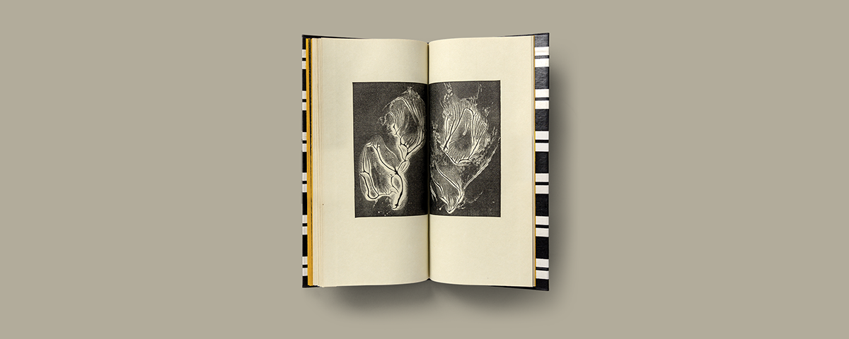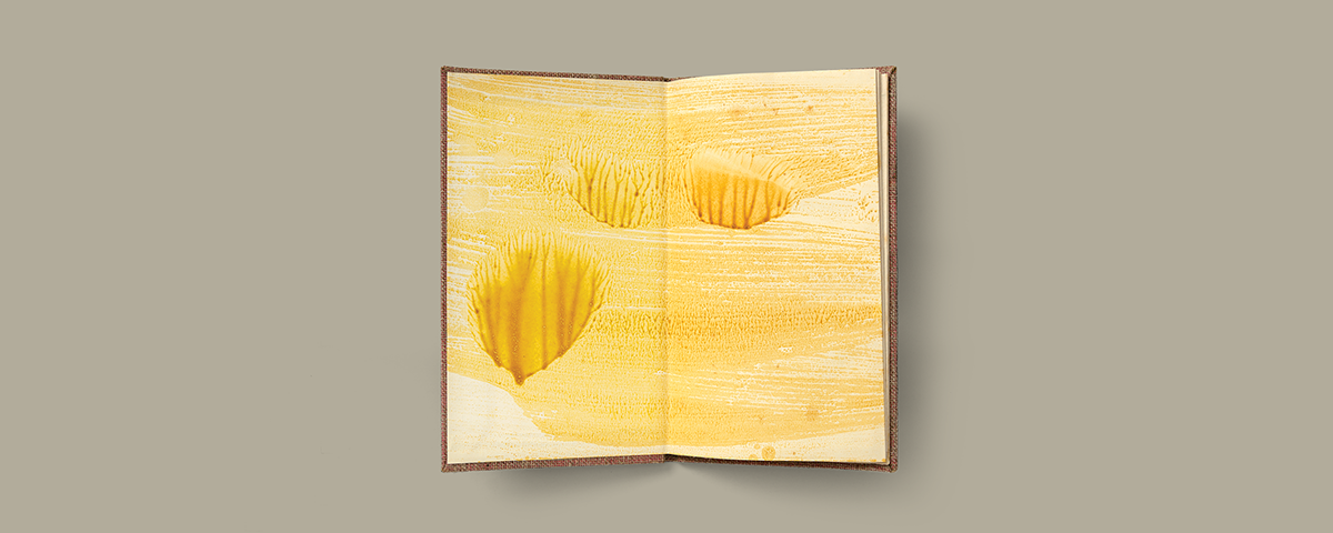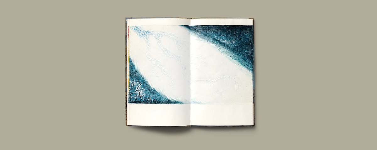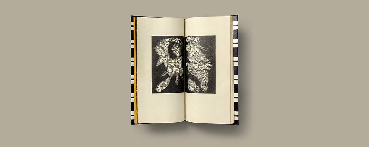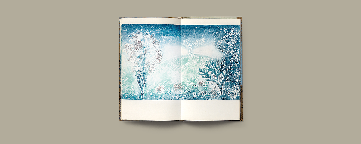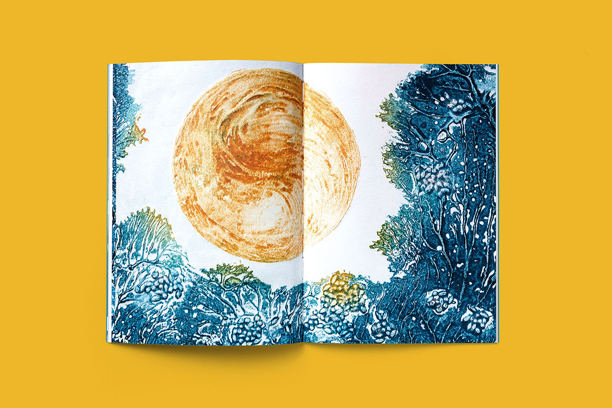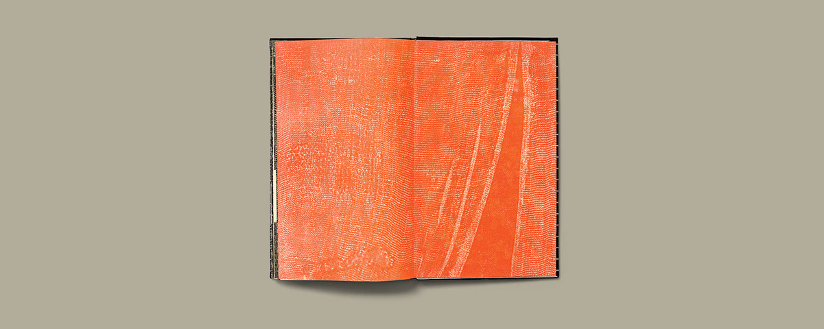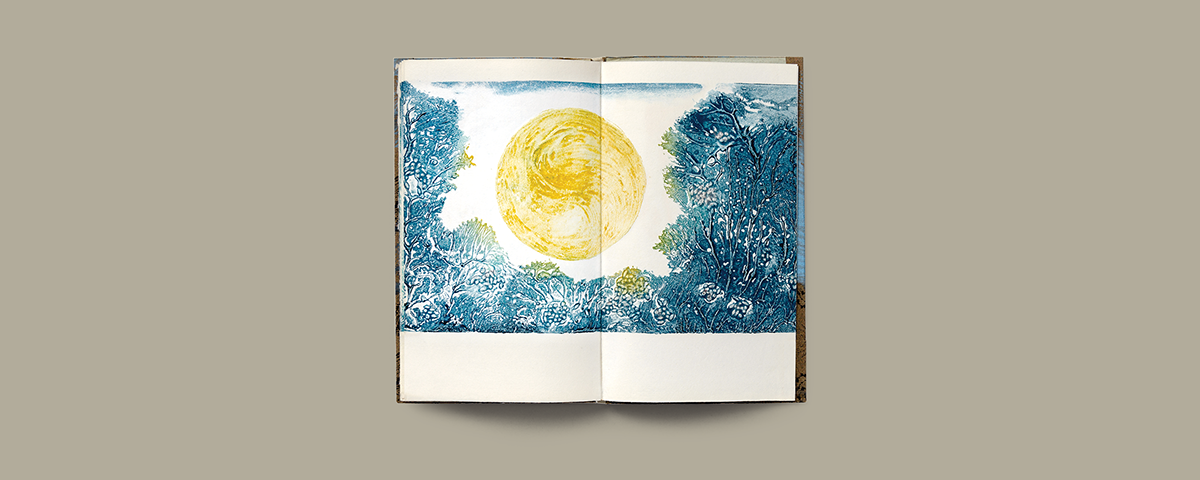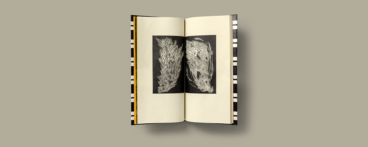 … as nove imagens em papel japonês Hosho são impressas, a duas cores, a partir de matrizes de linóleo cortadas progressivamente. Intercaladas a estas, páginas de texto em papel amarelo trazem sutis texturas em branco, produzidas com impressão indireta de objetos da natureza.
