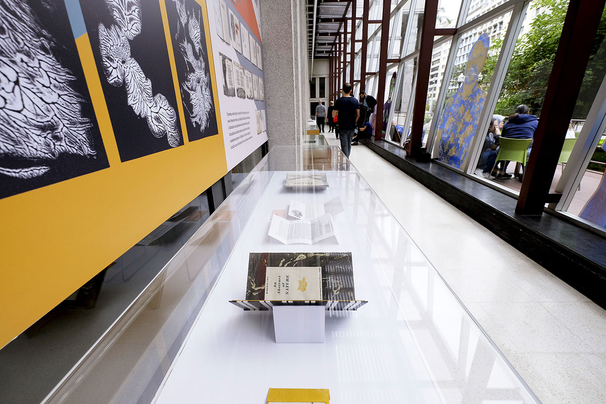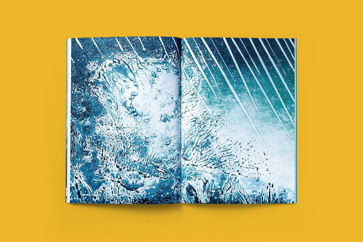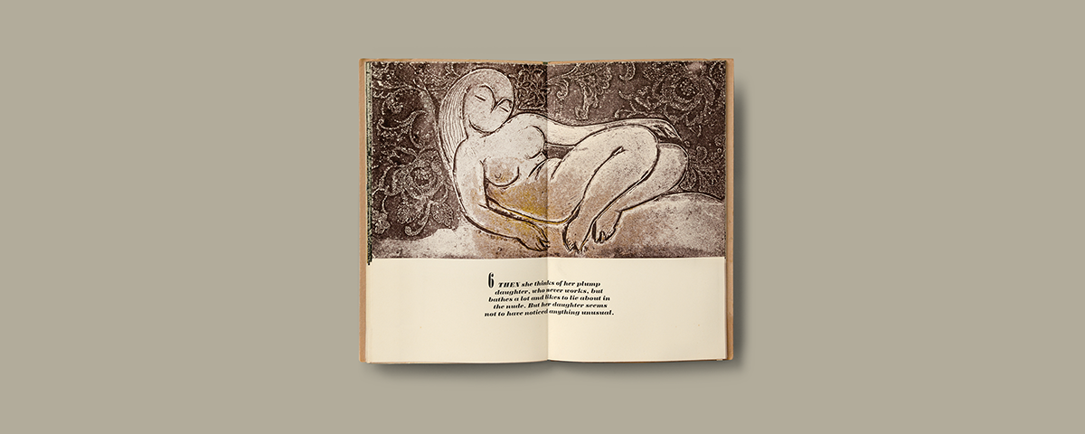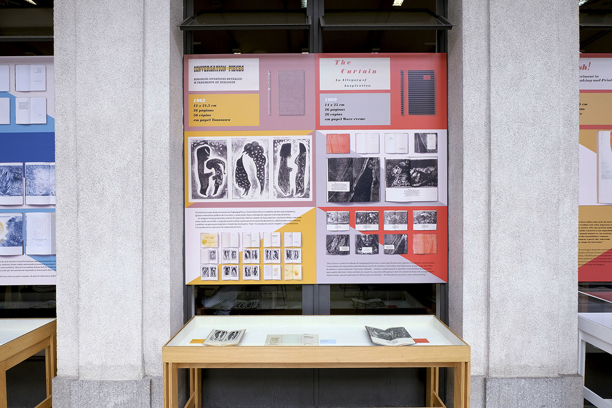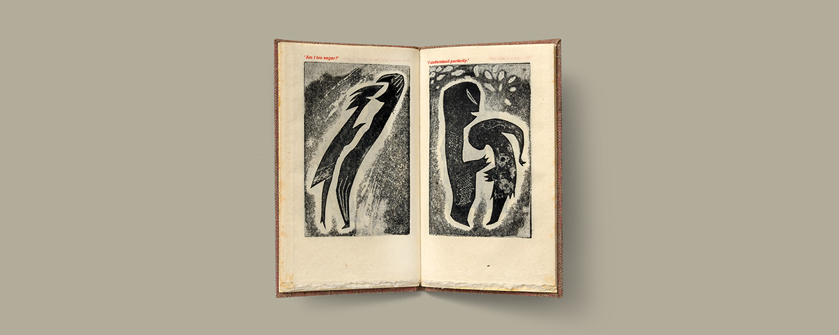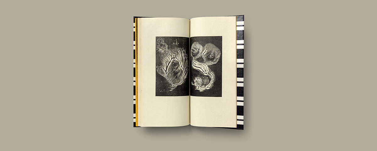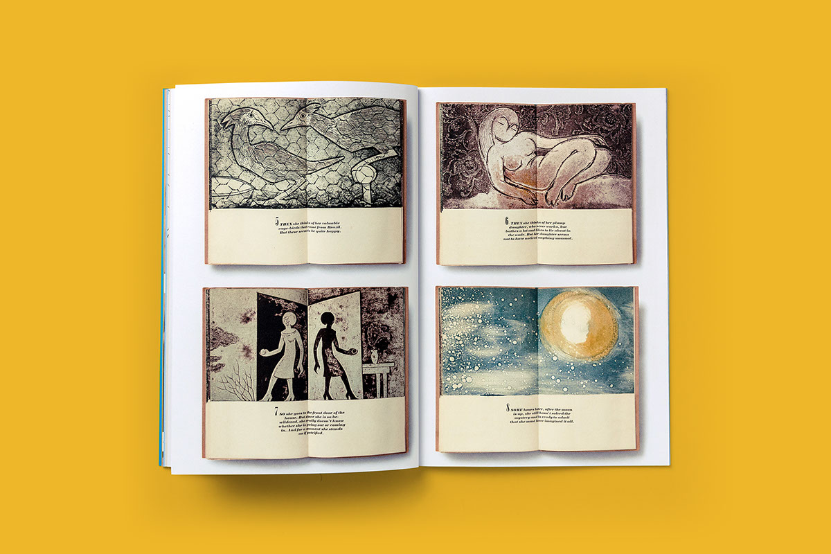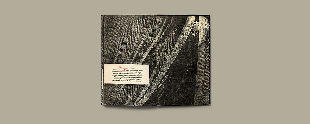 … as nove imagens em papel japonês Hosho são impressas, a duas cores, a partir de matrizes de linóleo cortadas progressivamente. Intercaladas a estas, páginas de texto em papel amarelo trazem sutis texturas em branco, produzidas com impressão indireta de objetos da natureza.