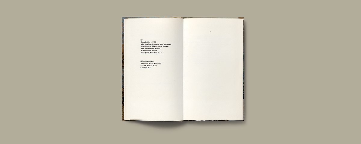 de Morris Cox publicou trinta e cinco livros. Trinta e cinco livros que Cox escreveu. Ilustrou. E diagramou. Trinta e cinco livros que ele mesmo imprimiu sozinho, utilizando máquinas construídas por ele. Trinta e cinco livros que também encadernou, um a um. Esta publicação apresenta alguns deles.