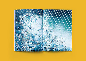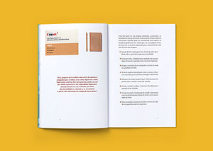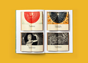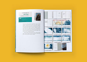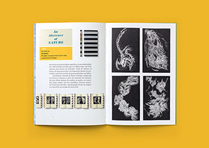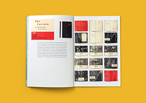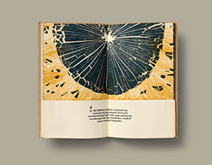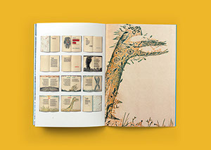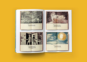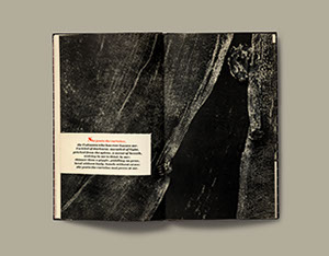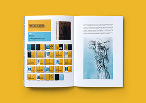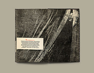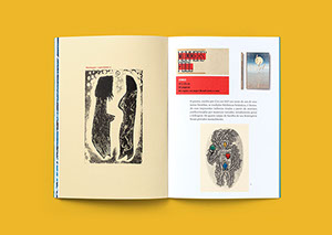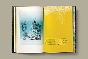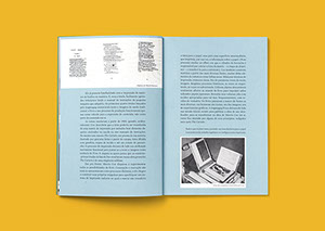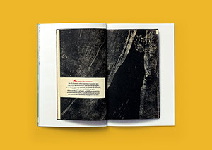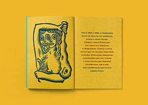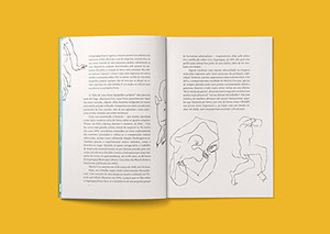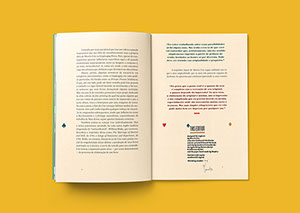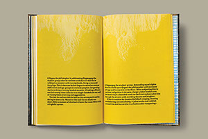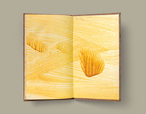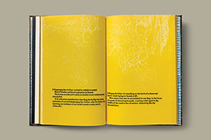 a estas, páginas de texto em papel amarelo trazem sutis texturas em branco, produzidas com impressão indireta