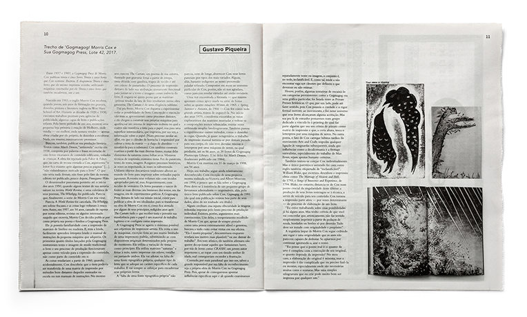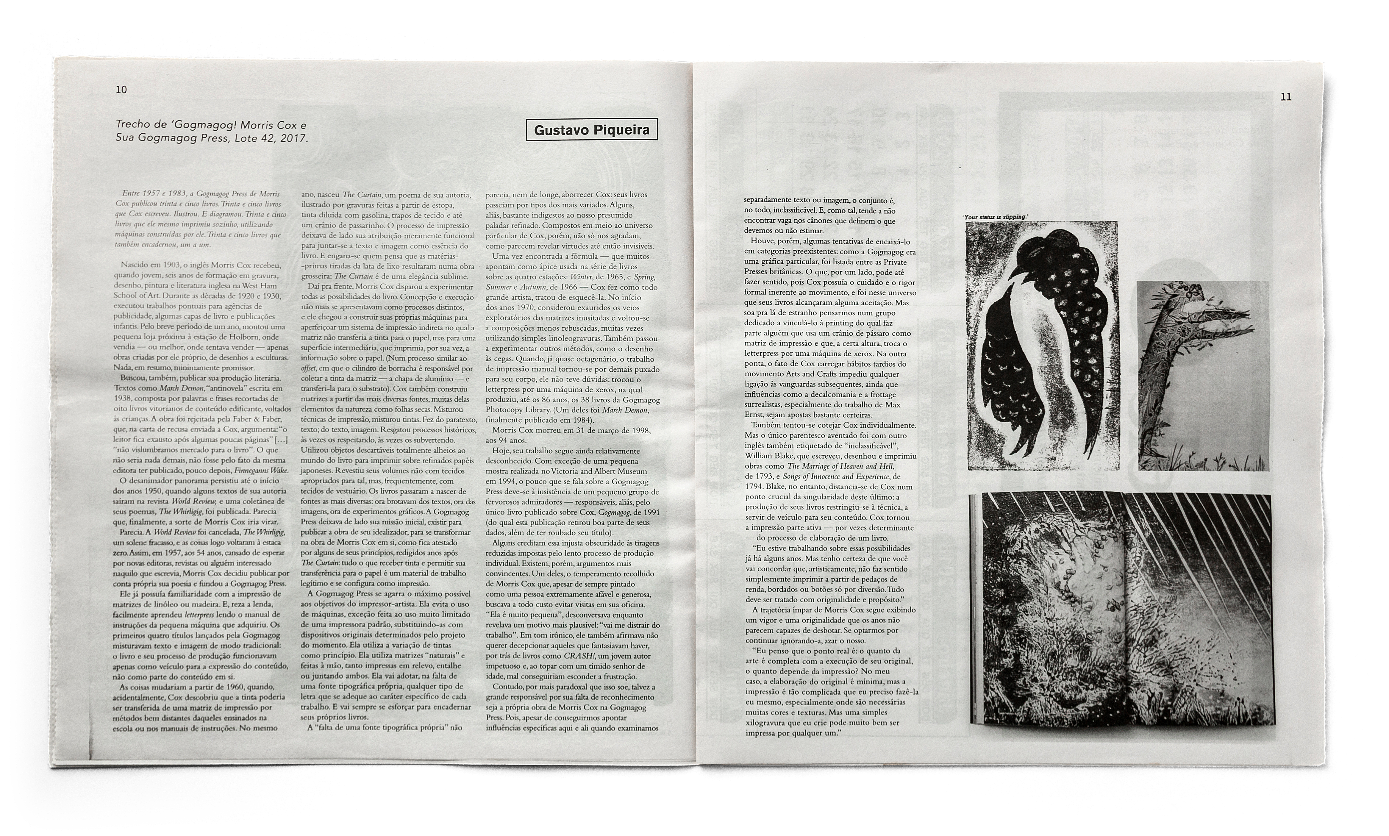 "A história do editor, poeta, ilustrador e impressor inglês Morris Cox (1903-1998), fundador da Editora Gogmagog, de Londres, é contada no livro Gogmagog! Morris Cox e sua Gogmagog Press, de Gustavo Piqueira, recentemente lançado pela Editora Lote 42."