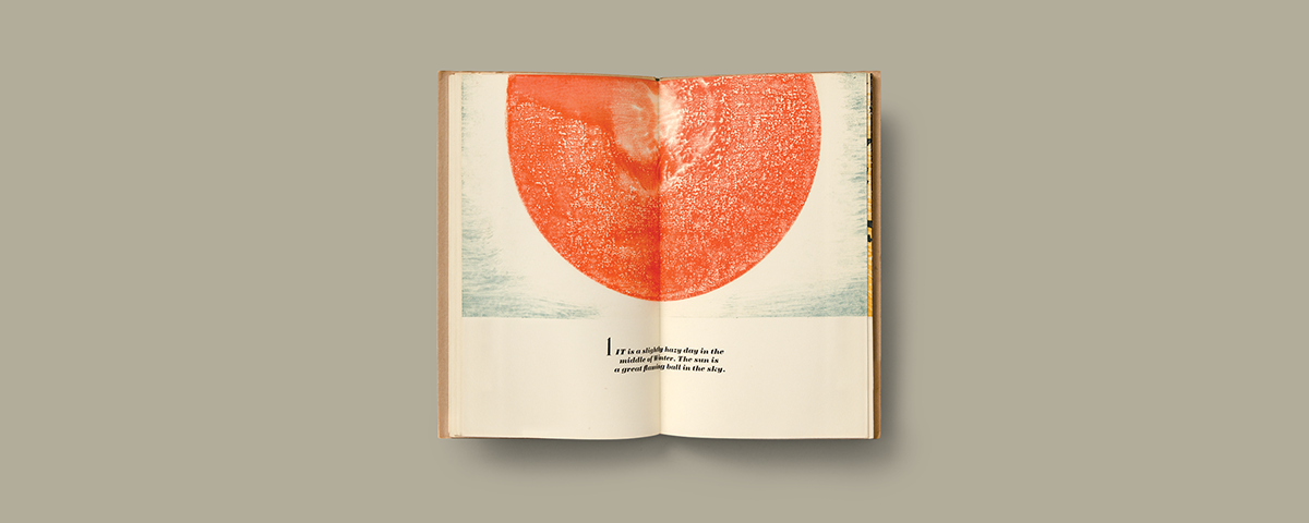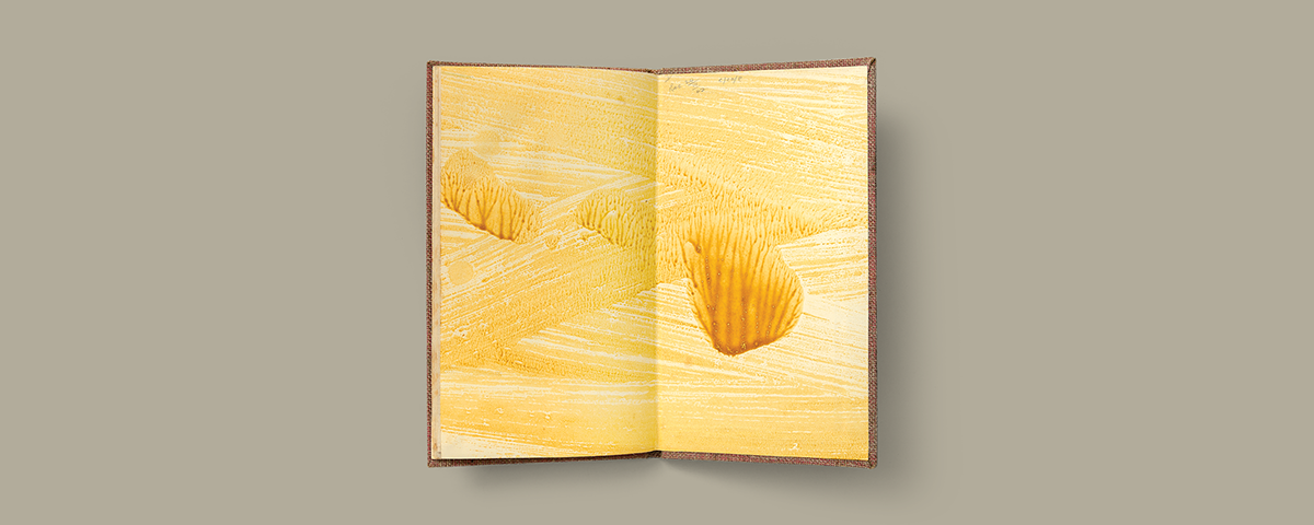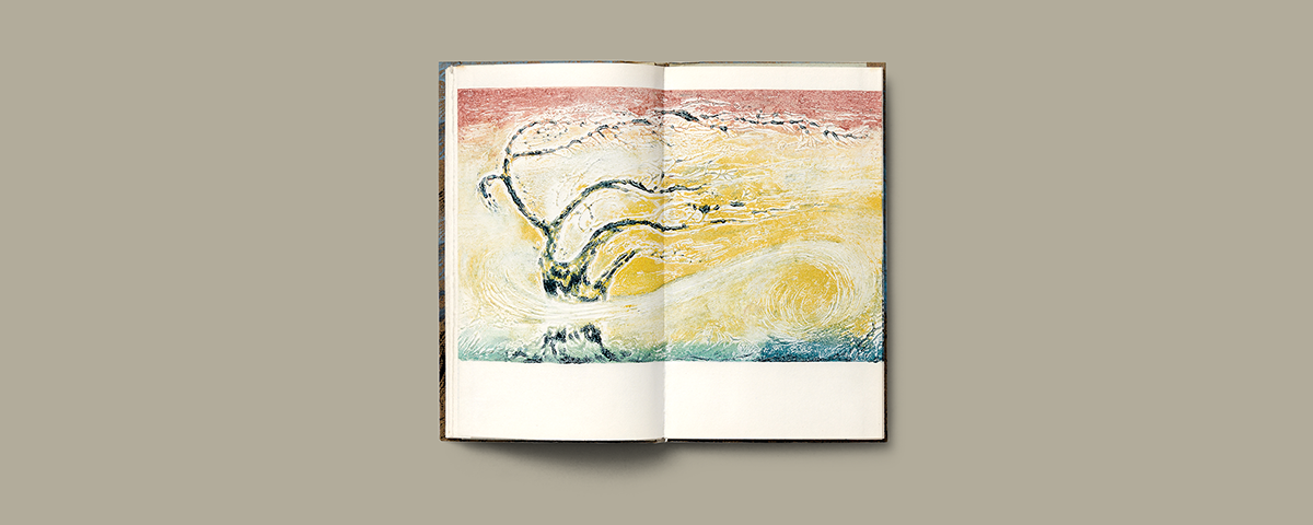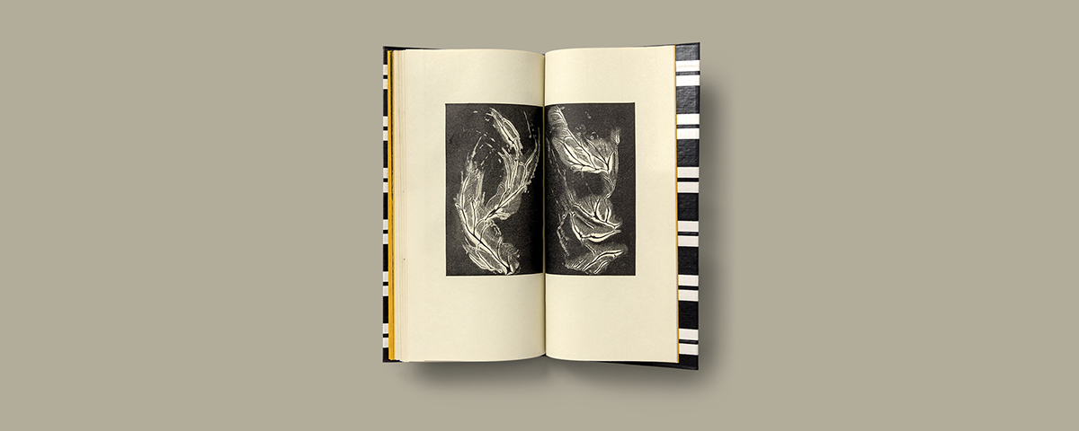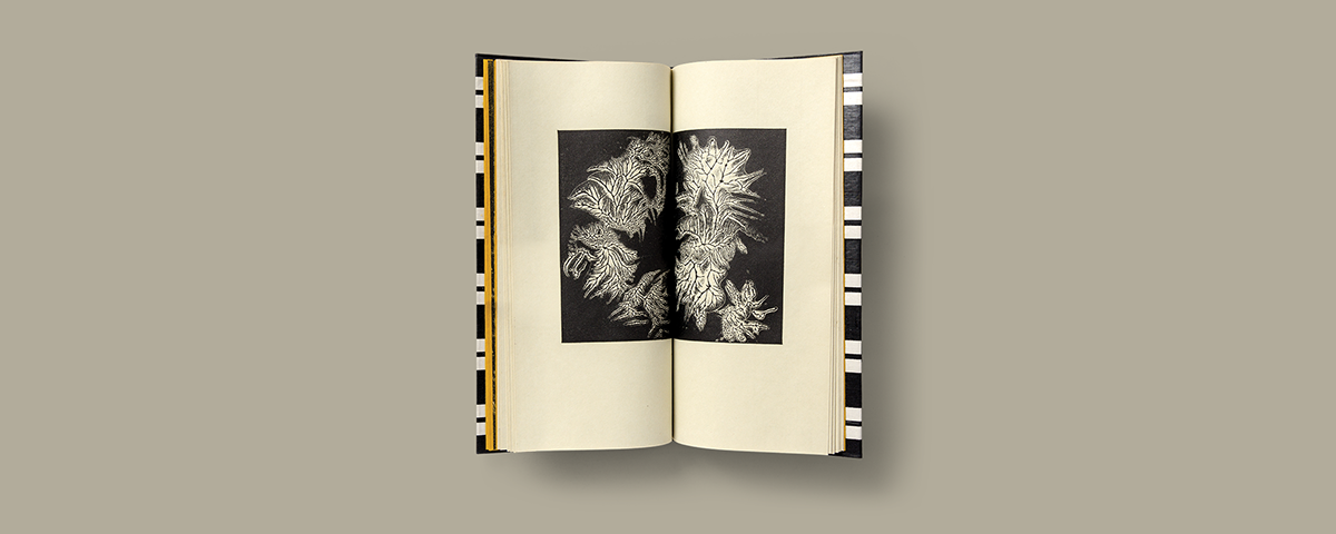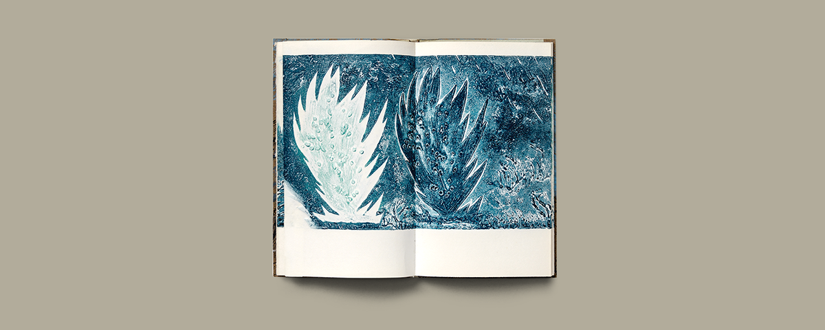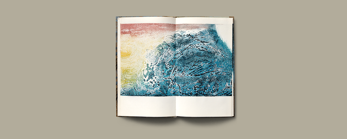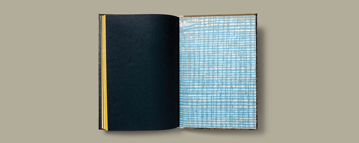 … as nove imagens em papel japonês Hosho são impressas, a duas cores, a partir de matrizes de linóleo cortadas progressivamente. Intercaladas a estas, páginas de texto em papel amarelo trazem sutis texturas em branco, produzidas com impressão indireta de objetos da natureza.